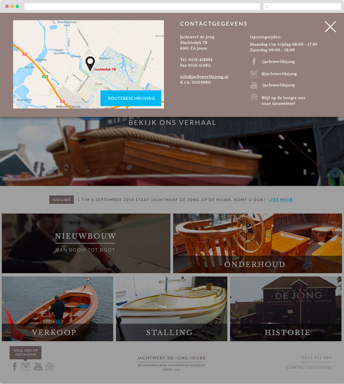 Het vakmanschap, rijke historie en de sfeer van Jachtwerf de Jong laat zich het beste vatten in een film. Op de welkomstpagina hebben we gebruik gemaakt van een film die direct start bij landing op de homepagina. Door de film extern te laten uploaden wordt de film snel gestart en blijft de snelheid van de website intact.