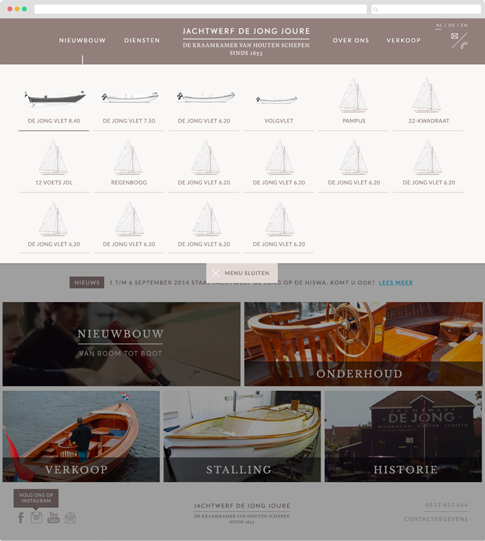 Jachtwerf de Jong kent een rijke historie. Deze historie verdiend het om rijkelijk verteld te worden. De historiepagina kenmerkt zich door wederom een visuele weergave met schermvullende afbeeldingen, uitleg en een strakke tijdlijn.