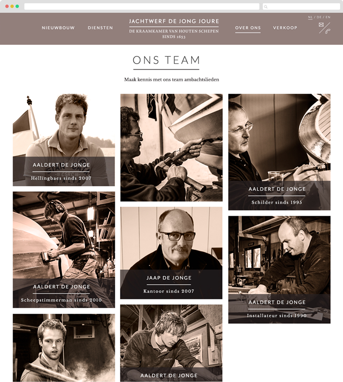 Jachtwerf de Jong is een Friese jachtwerf waar al sinds 1653 houten schepen worden gebouwd en waar alleen de allerbeste vakmensen werken. Jachtwerf de Jong staat voor vakmanschap, hoog afwerkingsniveau en oog voor detail. De Hellingbaes Aaldert de Jong heeft oog voor detail en design. Het verzoek aan ons om zijn fantastische vloot boten en wijde opzet aan diensten te etaleren op het internet. De doelstelling voor de nieuwe website is het gevoel van de werf, het product, de sfeer, het ambacht en de historie op een heldere en eigentijdse wijze communiceren.